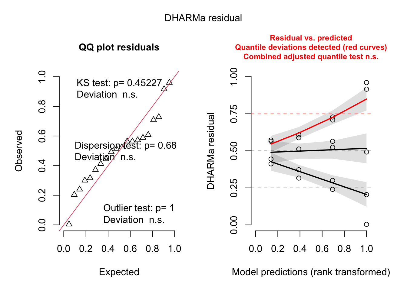 Utilizamos los paquetes `performance` y `DHARMa` para verificar las premisas de normalidad y homocedasticidad.