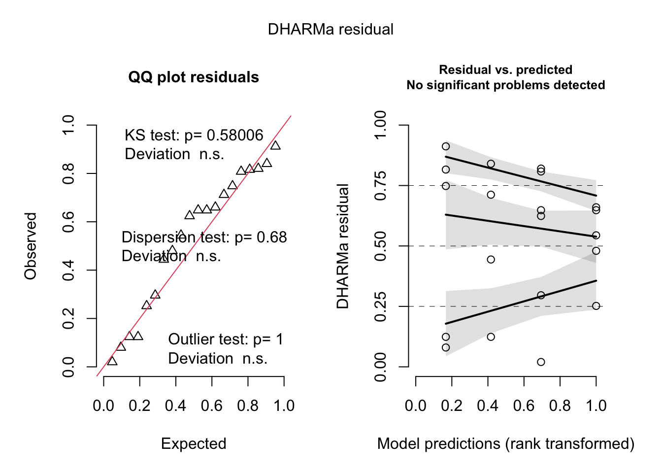 Utilizamos los paquetes performance y DHARMa para verificar las premisas de normalidad y homocedasticidad.