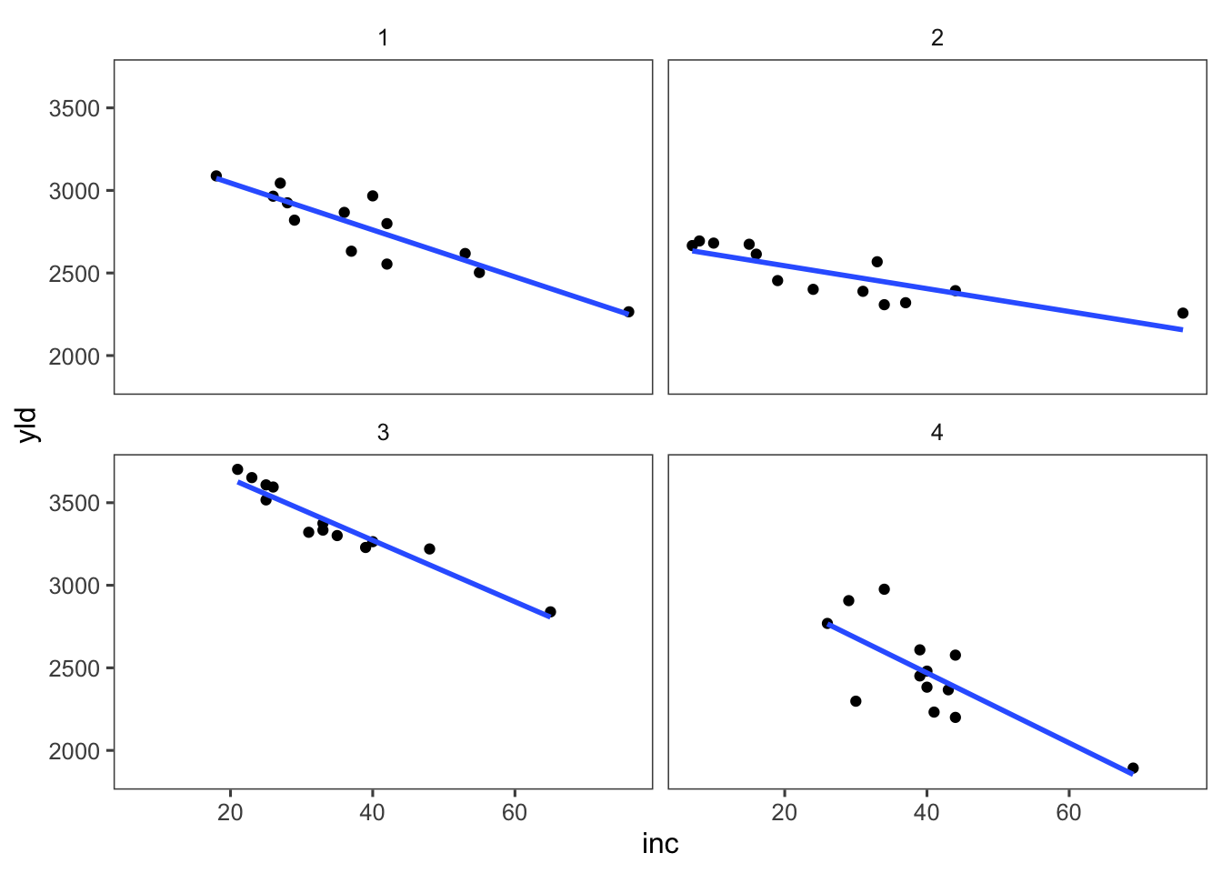 Visualizamos la relación entre las variables `inc` y `yld` del conjunto de datos `mofo`.