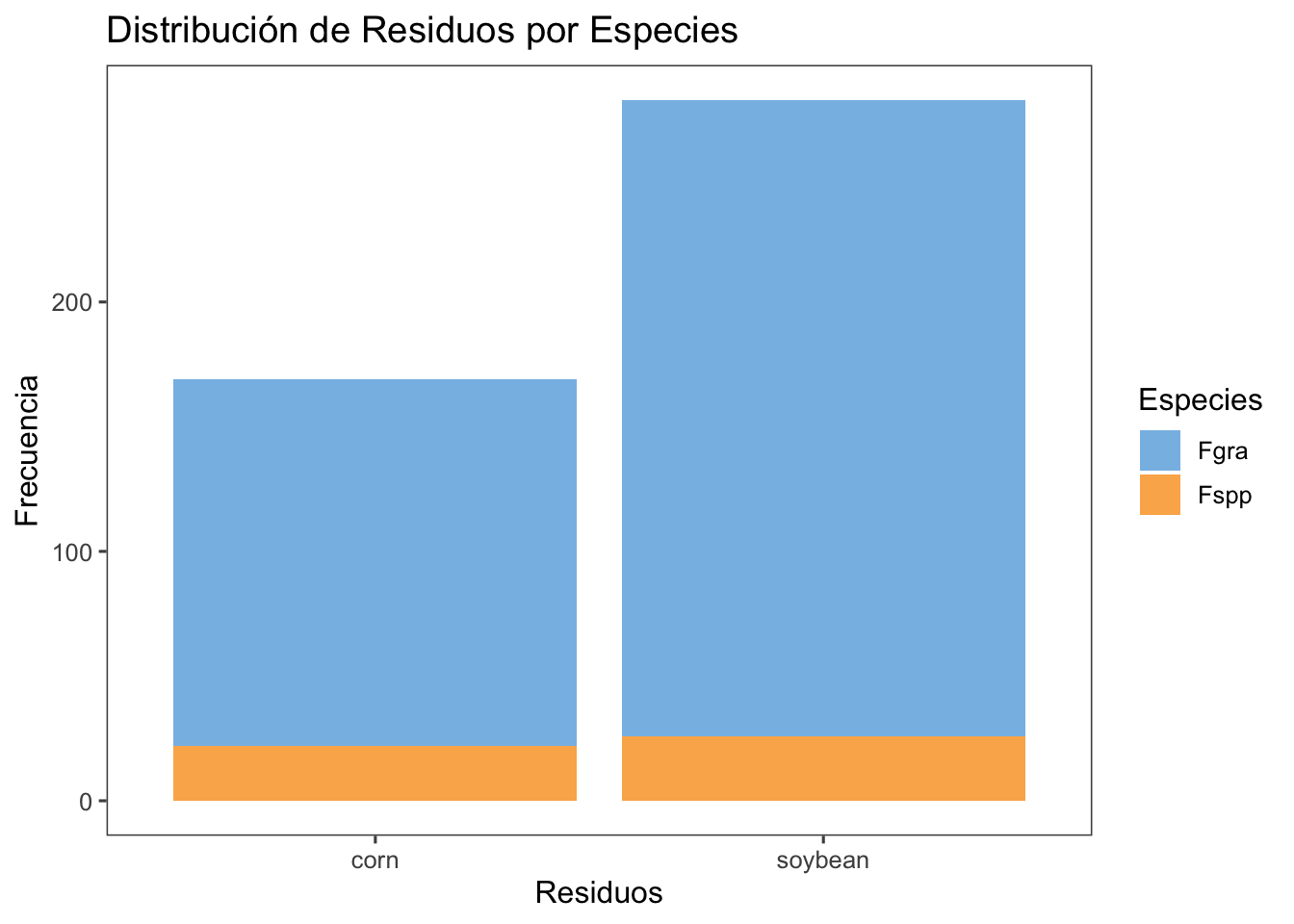 Considera un estudio sobre la presencia de especies de fusarium en diferentes tipos de residuos de cultivos. Supongamos que tenemos datos sobre el tipo de residuo utilizado (variable residue) y el tipo de especie de fusarium (variable species). Una tabla de contingencia nos permitiría ver cuántas veces se ha encontrado cada tipo de especie de fusarium en cada tipo de residuo de cultivo, lo cual es esencial para analizar si hay alguna preferencia o patrón de crecimiento entre diferentes residuos de cultivos.