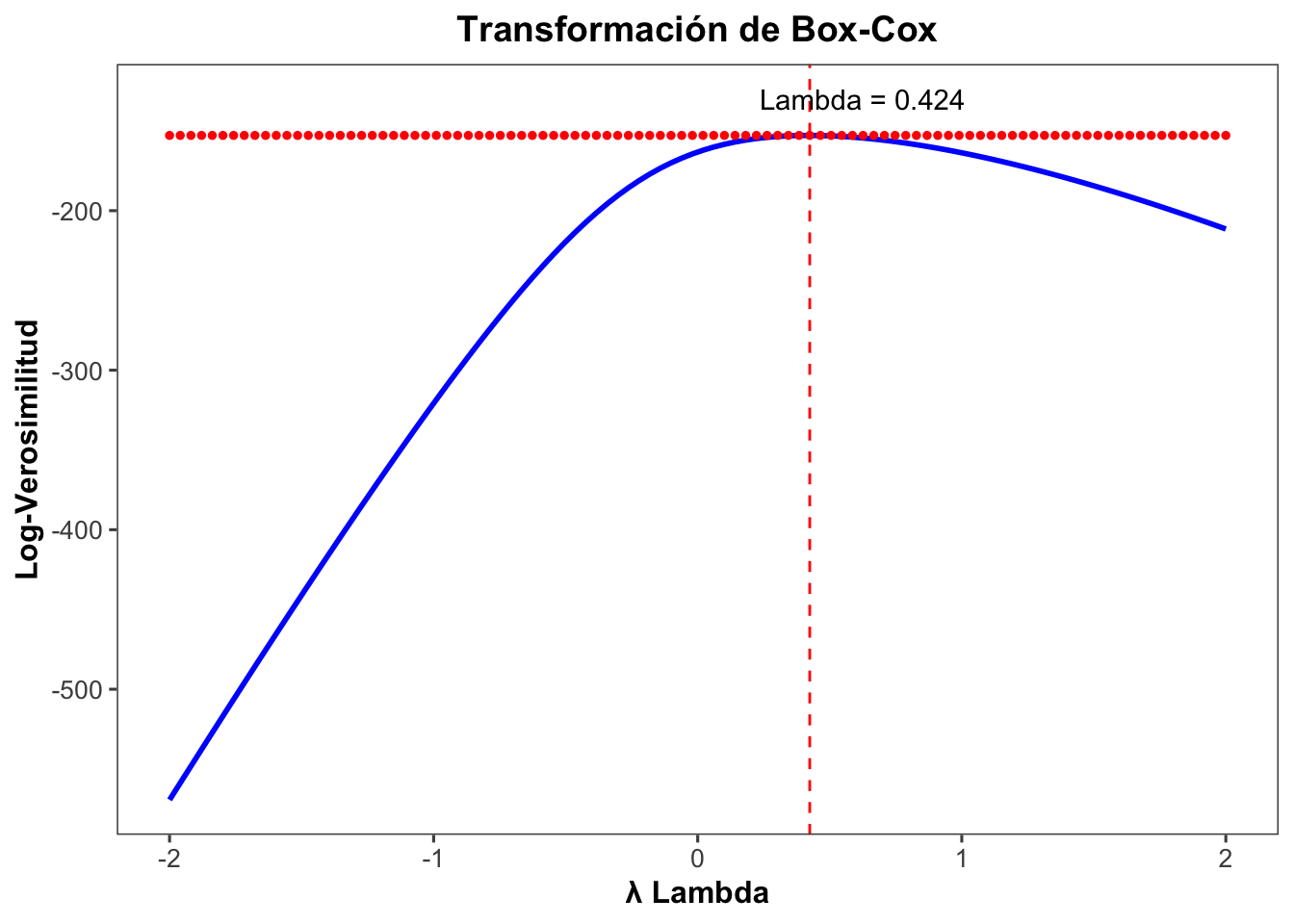 El valor óptimo de λ se encuentra seleccionando el valor de λ que maximiza la log-verosimilitud devuelta por boxcox().