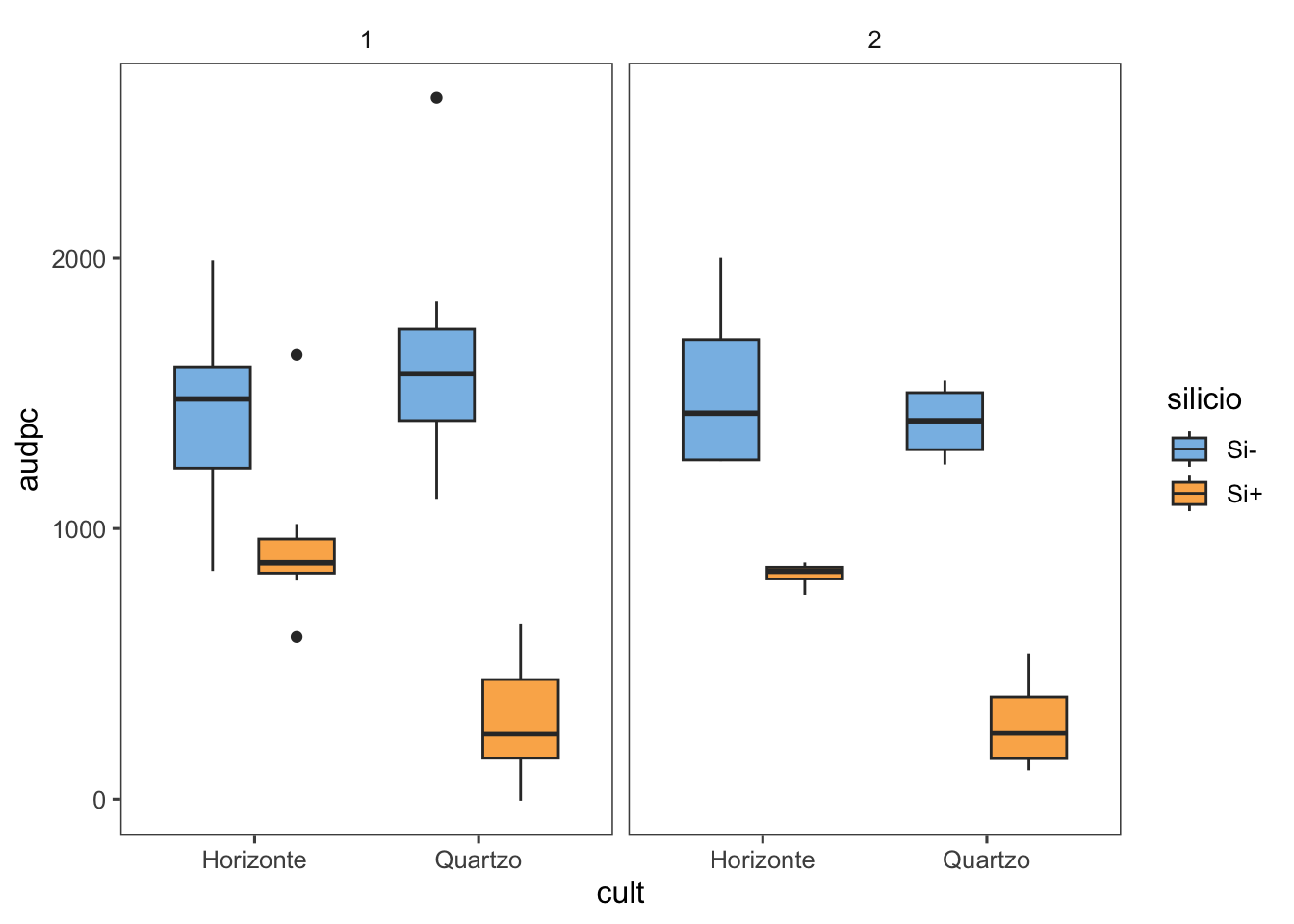 ## Análisis de Área Bajo la Curva de Progreso de la Enfermedad (AUDPC)### ¿Qué es el AUDPC?El Área Bajo la Curva de Progreso de la Enfermedad (AUDPC, por sus siglas en inglés) es una medida utilizada en fitopatología para cuantificar el progreso de enfermedades en plantas a lo largo del tiempo. Esta métrica es ampliamente utilizada para comparar la severidad y el impacto de enfermedades entre diferentes tratamientos, variedades de plantas, o condiciones ambientales.### ¿Cómo se Calcula el AUDPC?El AUDPC se calcula a partir de observaciones repetidas de la severidad de la enfermedad en diferentes momentos del tiempo. La fórmula general para el cálculo del AUDPC es:`AUDPC = sum_{i=1}^{n-1} ({y_{i+1} + y_i}{2}) (t_{i+1} - t_i)`Donde: - `y_i` es la severidad de la enfermedad en el momento `t_i`. - `t_i` es el tiempo de la `i`-ésima observación. - `n` es el número total de observaciones.### Importancia del AUDPC1. **Comparación de Tratamientos**: - Permite comparar la eficacia de diferentes tratamientos en el control de enfermedades. - Ayuda a identificar qué tratamiento ofrece la mejor protección contra una enfermedad específica.2. **Evaluación de Variedades de Plantas**: - Utilizado para evaluar la resistencia de diferentes variedades de plantas a una enfermedad. - Ayuda a los fitomejoradores a seleccionar variedades más resistentes para programas de mejoramiento.3. **Monitoreo del Progreso de la Enfermedad**: - Proporciona una visión general del progreso de la enfermedad a lo largo del tiempo. - Permite a los investigadores y agricultores tomar decisiones informadas sobre el manejo de la enfermedad.4. **Investigación y Desarrollo**: - Fundamental en estudios de epidemiología vegetal y en la investigación sobre la dinámica de las enfermedades. - Ayuda a entender cómo diferentes factores (ambientales, genéticos, etc.) afectan el desarrollo de la enfermedad.### Ejemplo Práctico en RAquí hay un ejemplo práctico de cómo calcular el AUDPC utilizando R, usando un conjunto de datos ficticio sobre la severidad de una enfermedad en diferentes días.La AUDPC es una medida utilizada para cuantificar el progreso de enfermedades en plantas a lo largo del tiempo.### Cargar Paquetes```{r}library(datapasta)library(janitor)library(gsheet)library(googlesheets4)library(tidyverse)library(gsheet)library(cowplot)library(patchwork)library(ggthemes)library(epifitter)library(ggplot2)library(nlme)library(lme4)library(DHARMa)library(performance)library(report)library(emmeans)library(multcompView)library(multcomp)library(corrplot)library(see)library(lubridate)library(agridat)library(cowplot)library(agricolae)library(sf)library(broom)library(lattice)library(car)library(scales)library(readxl)library(dplyr)library(knitr)library(kableExtra)library(easyanova)library(tidyr)library(PerformanceAnalytics)library(magrittr)library(car)library(ggpubr)library(rstatix)library(reshape)library(kableExtra)library(formattable)library(sjPlot)library(sjlabelled)library(sjmisc)library(ggh4x)library(gridExtra)library(stringr)library(epiR)library(ggridges)library(DT)library(agricolae)library(ec50estimator)library(readxl)library(tidyverse)library(report)library(rstatix)```### Cargar Datos y Agrupar```{r}curve <-read_excel("dados-diversos.xlsx", sheet ="curve")curve|> DT::datatable(extensions ='Buttons', options =list(dom ='Bfrtip', buttons =c('excel', "csv")))```Vamos a cargar un archivo Excel que contiene los datos de severidad de la enfermedad y luego los agrupamos por tratamientos y días.```{r}curve2 <- curve |>group_by(Irrigation, day) |>summarize(mean_severity =mean(severity),sd_severity =sd(severity))curve2|> DT::datatable(extensions ='Buttons', options =list(dom ='Bfrtip', buttons =c('excel', "csv"))) |>formatRound(c('mean_severity','sd_severity'), 2)```### Visualizar AUDPC```{r}curve2 |>ggplot (aes(day, mean_severity, linetype = Irrigation, shape = Irrigation, group = Irrigation, color=Irrigation))+geom_line(linewidth =1)+geom_point(size =3, shape =16)+geom_errorbar(aes(ymin = mean_severity - sd_severity, ymax = mean_severity + sd_severity), width =0.1) +labs(title ="Severidad Media por Día e Irrigación",x ="Día",y ="Severidad (%)")+theme_few()+scale_color_few()```### Calcular AUDPC y Comparar```{r}curve3 <- curve |>group_by(Irrigation, rep) |>summarise(audpc =AUDPC(day, severity, y_proportion =FALSE)) |>pivot_wider(names_from = Irrigation, values_from = audpc)curve3|> DT::datatable(extensions ='Buttons', options =list(dom ='Bfrtip', buttons =c('excel', "csv")))|>formatRound(c('Drip','Furrow'), 2)``````{r}t.test(curve3$Drip, curve3$Furrow)```### Interpretación de Resultados- **Visualización Gráfica**: - El gráfico muestra la severidad media de la enfermedad a lo largo del tiempo para diferentes tratamientos de irrigación. - Las barras de error indican la variabilidad de las observaciones.- **Prueba t**: - La prueba t compara las medias de AUDPC entre dos tratamientos de irrigación (por ejemplo, riego por goteo y riego por surco). - Un resultado significativo indicaría una diferencia estadísticamente significativa en el progreso de la enfermedad entre los dos tratamientos.### Ejercicio Práctico: irrigación- **Cálculo del AUDPC**: - La función `AUDPC` calcula el área bajo la curva de progreso de la enfermedad para cada combinación de tratamiento y repetición. - Valores más altos de AUDPC indican un mayor progreso de la enfermedad, mientras que valores más bajos indican un menor progreso.```{r}library(epifitter)dat1 <- curve |>group_by(Irrigation,rep) |>summarize( audpc=AUDPC(day,severity))dat1t<-63dat1_audpc <- dat1 |>mutate(audpc2 = audpc / t)dat1_audpc dat1_audpc |> DT::datatable(extensions ='Buttons', options =list(dom ='Bfrtip', buttons =c('excel', "csv")))|>formatRound(c("audpc","audpc2"),2)``````{r}dat1_audpc_f<- dat1_audpc |>group_by(Irrigation) |>summarize(audpc =sum(audpc),TPD=mean(audpc2))dat1_audpc_f |> DT::datatable(extensions ='Buttons', options =list(dom ='Bfrtip', butt