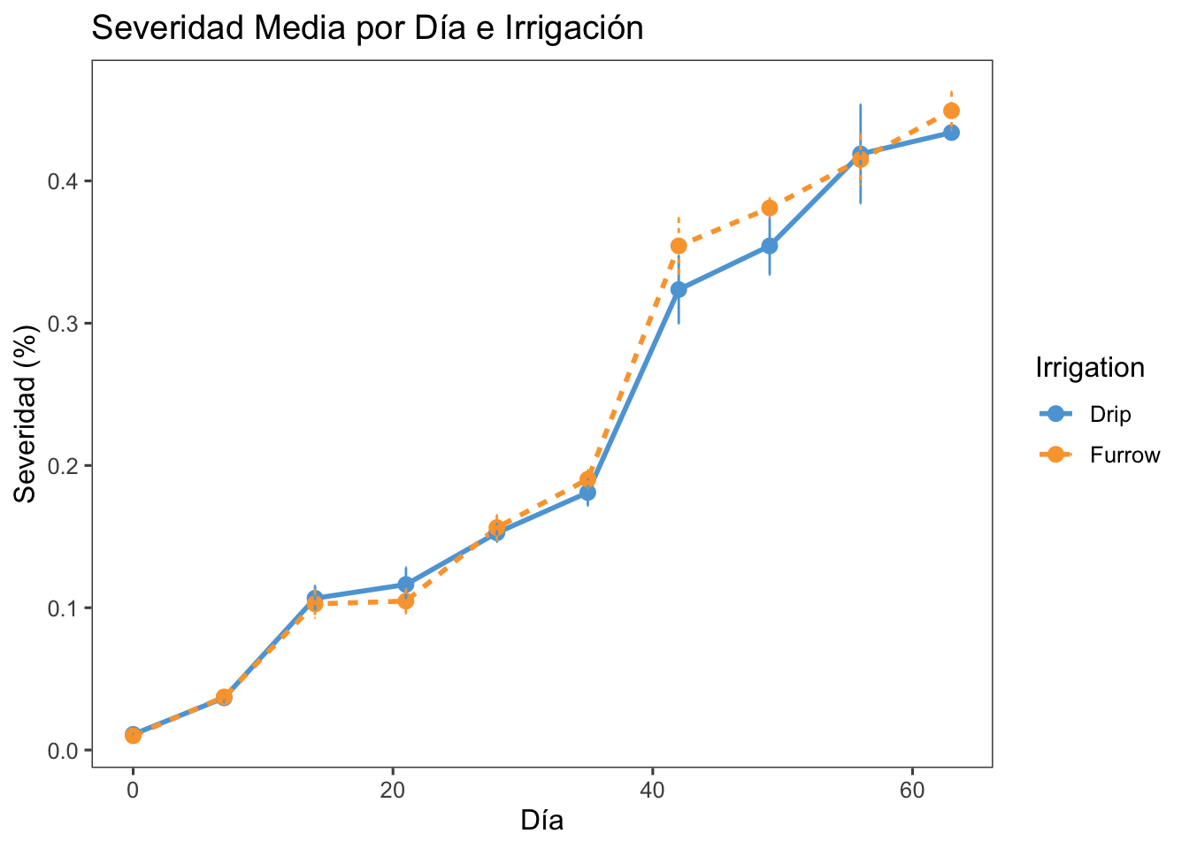 El gráfico muestra la severidad media de la enfermedad a lo largo del tiempo para diferentes tratamientos de irrigación.