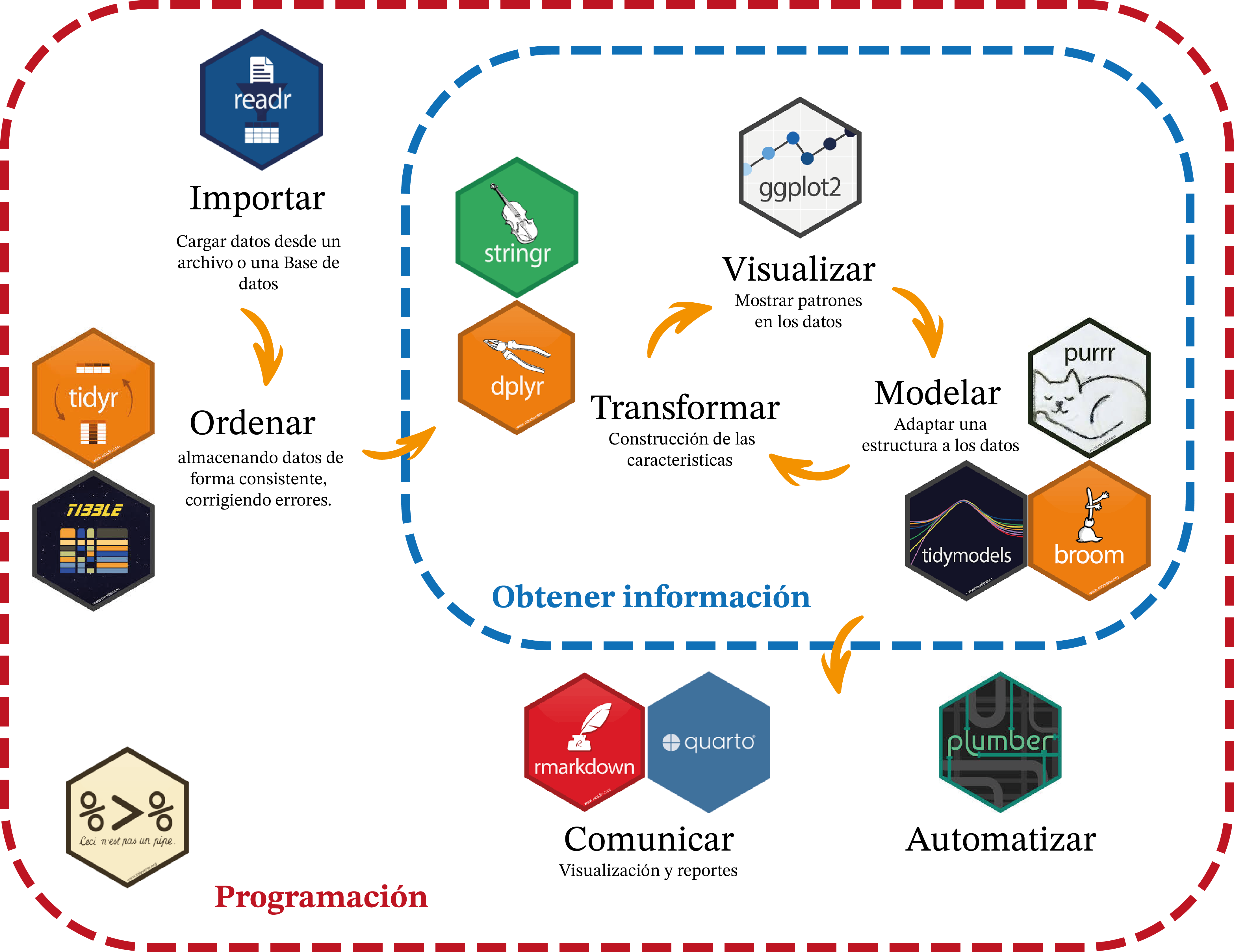 Los paquetes necesarios para ejecutar análisis en R dependen del objetivo del trabajo a realizar, pero algunos paquetes son básicos y esenciales para la mayoría de los análisis, como: Tidyverse, dplyr, readxl, ggplot2, etc. En las próximas clases, profundizaremos un poco más sobre estos paquetes.