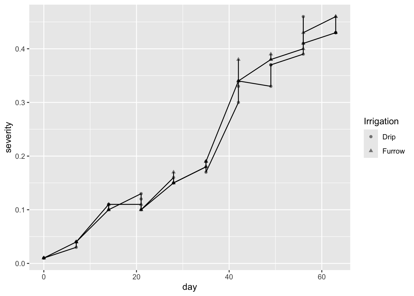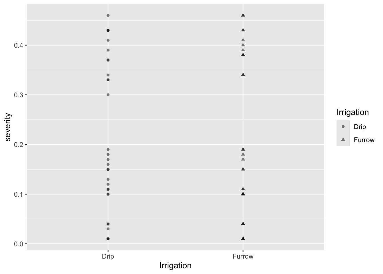 # Selección de columnas y gráfico de puntosmg %>%select(Irrigation, severity) %>%ggplot(aes(Irrigation, severity, shape = Irrigation)) +geom_point(alpha =0.5)