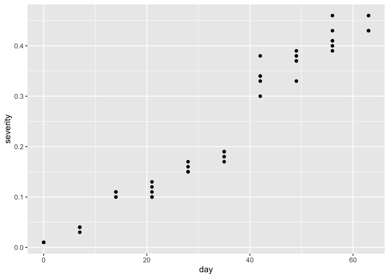 # Gráfico de cajas y puntosmg %>%select(day, severity) %>%ggplot(aes(day, severity)) +geom_point()