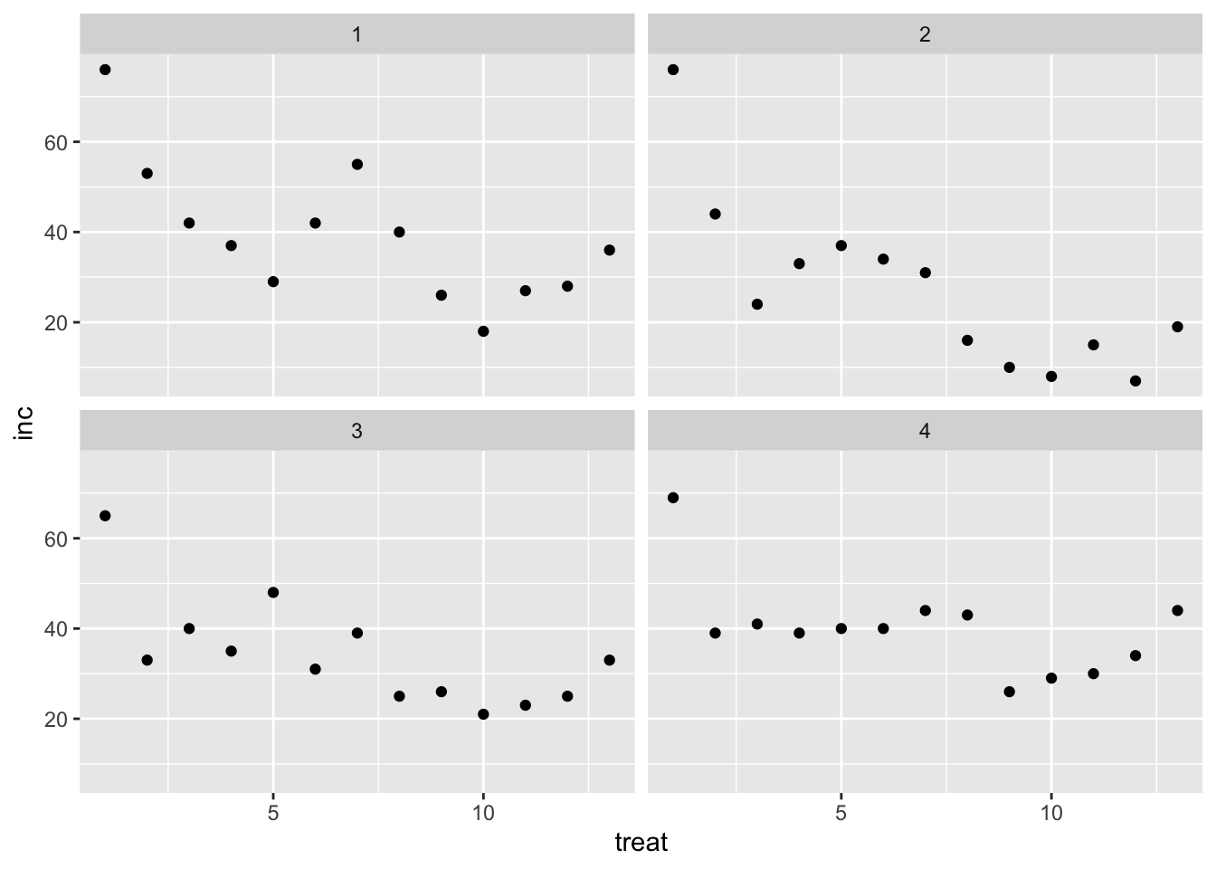 # Gráfico de dispersión de la incidencia por tratamientos y estudiosmofo |>ggplot(aes(treat, inc)) +facet_wrap(~study) +# Facetas por estudiogeom_point() # Puntos de dispersión